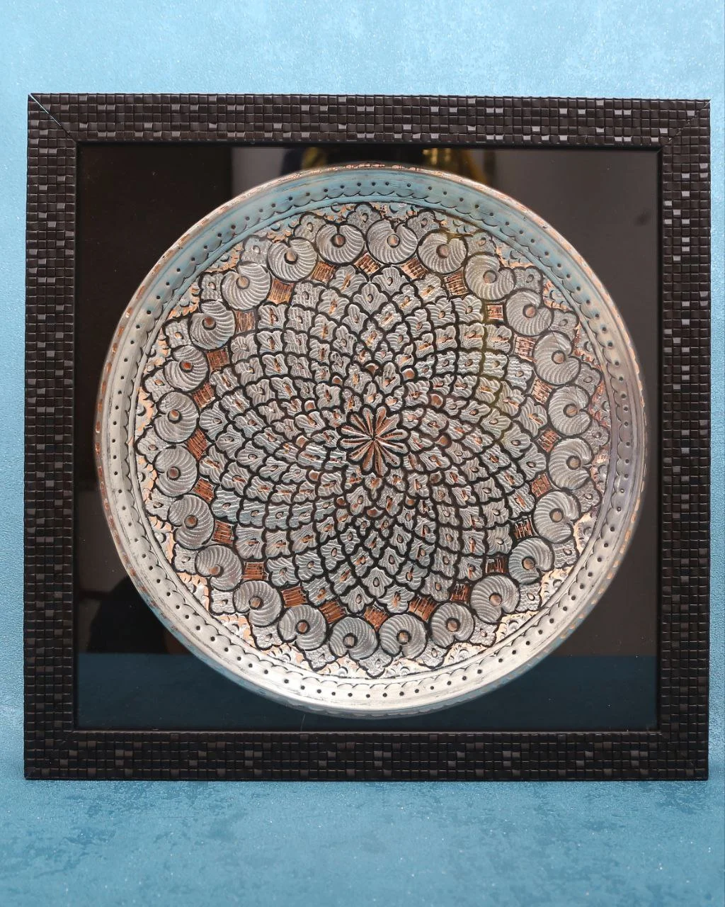 تابلو قلم زنی مسی طول و عرض ۳۶ سانتی متر، این تابلو یک مربع کامل و متقارن را تشکیل می دهد، که به دلیل سایز استاندارد خود، چه به صورت انفرادی و چه در چیدمان های چندتایی، هویت و اصالت ویژه ای به فضای دیوار می بخشد.