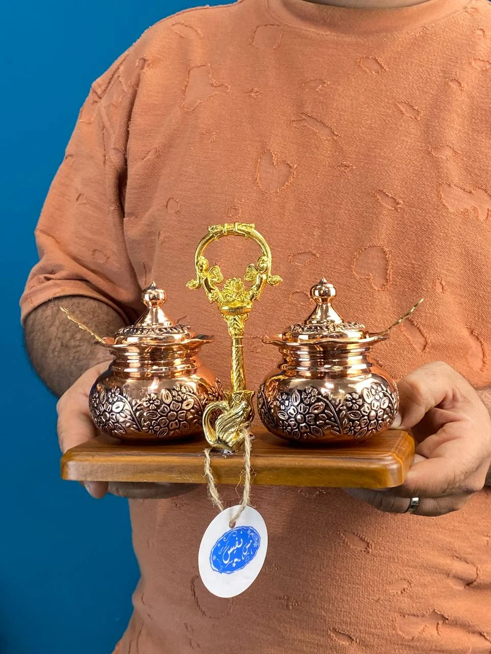 جاادویه مسی ۲ عددی با استند چوبی وکیوم ، ساخت زنجان تمام مس،با استند وکیوم دسته برنجی نانوشده و بدون تغییر رنگ میباشد.