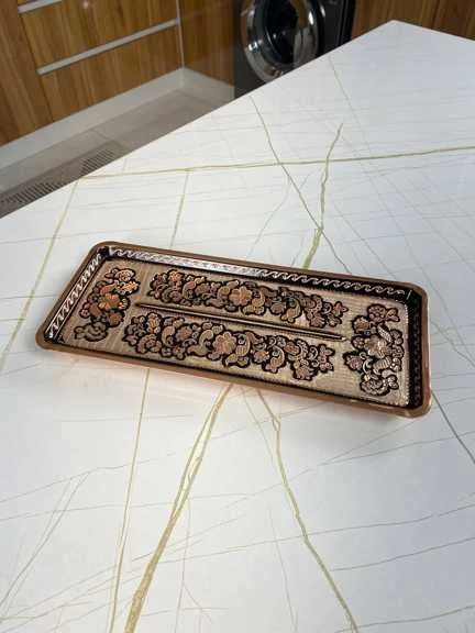 رولت خوری مسی نقره کوب یک صفحه سرو مجلل است که هنر دقیق فلزکاری زنجان را با تضاد بصری چشم نواز به نمایش می گذارد. این ظرف نه تنها یک ابزار سرو بلکه یک اثر هنری است که در آن خطوط ظریف نقره به زیبایی بر روی پس زمینه گرم و قرمز مس خالص نشسته اند. این کنتراست میان فلز مس و نقره جلوه ای کلاسیک و پرشکوه به میز شما می بخشد.