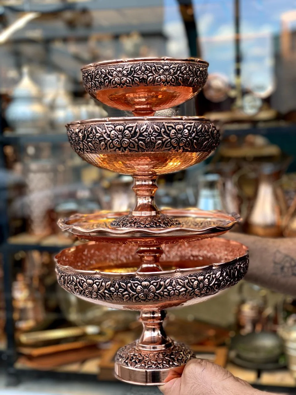 این مجموعه ی چهارپارچه،سرویس پذیرایی مسی گلبرگ نرگس ساخت زنجان ضیافتی از انحناهای شاعرانه و درخششِ ابدی است که با الهام از فرمِ آزادِ گلبرگ های نرگس، در کارگاههای پیشروِ زنجان از دلِ مسِ نفیس جان گرفته است. هنرمندان با ظرافتی وسواسی، لبههای هر ظرف را به صورت مواج و گل مانند فرم دادهاند تا نمایی ارگانیک و پویا به میز پذیرایی ببخشند؛ جایی که میوه خوری با قطر ۲۷ و ارتفاع ۱۶ سانتی متر به عنوان ستونِ اصلی، در کنار شیرینی خوری با قطر ۲۴، آجیل خوری با قطر ۲۲ و شکلات خوری با قطر ۱۸ سانتی متر، سمفونیِ کاملی از تناسبات هندسی را اجرا می کنند.