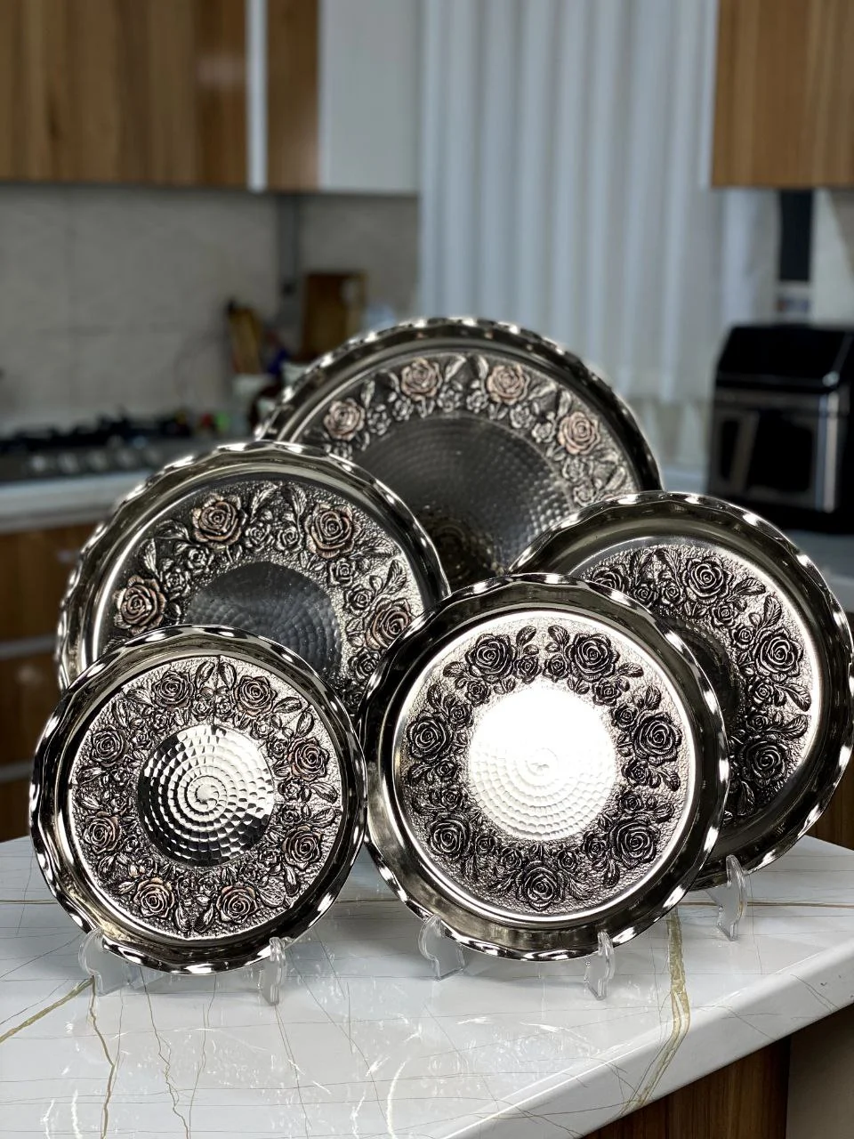 در زیرِ لایهی صیقلیِ کروم، ردپای ضربات چکش مانند نبضی آرام حس میشود که اصالتِ دستساز بودنِ اثر را در میانِ زرق وبرقِ مدرن حفظ کرده است. سینی مسی گلبرگ رز با آبکاری کروم، این سینی را به یک “مجمعهی لوکس” تبدیل کرده که برای میزبانیهای پرجمعیت و تشریفاتی طراحی شده است؛ ظرفی که به راحتی گنجایشِ ستهای کاملِ پذیرایی را دارد و به دلیل پوششِ کروم، در برابر لکههای آب و اثر انگشت مقاوم تر از مسِ خام عمل میکند. “سینی رز ۳۴ کروم”، بیانیه ی جسورانه ای از سلیقه در خانههای امروزی است؛ قطعهای که هم زمان تداعی گرِ اصالتِ مسگری زنجان و درخششِ نقره فامِ قصرهای مدرن است.