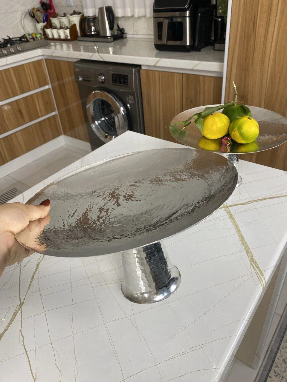 این شیرینیخوری پایه بلند شاهکارِ دست ساز با وزن ۶۸۰ گرم، از ورق های مسی با ضخامتِ بالا ساخته شده که پایداری و ثباتِ آن را در هنگام چیدمان های پرحجم تضمین میکند.