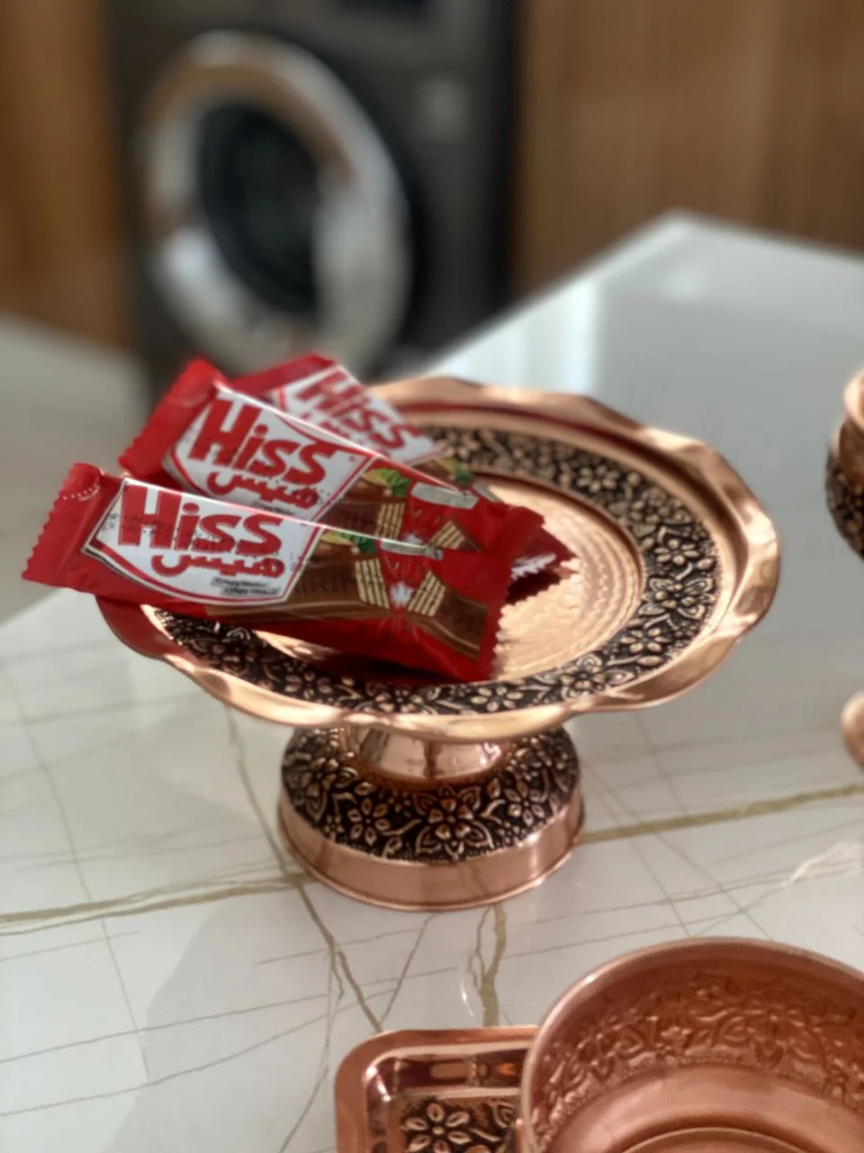 شیرینی خوری مسی گلبرگ نانو شده، قطعهای است که گویی از دلِ یک نقاشی کلاسیک بیرون آمده تا بر روی میز پذیرایی شما جان بگیرد.