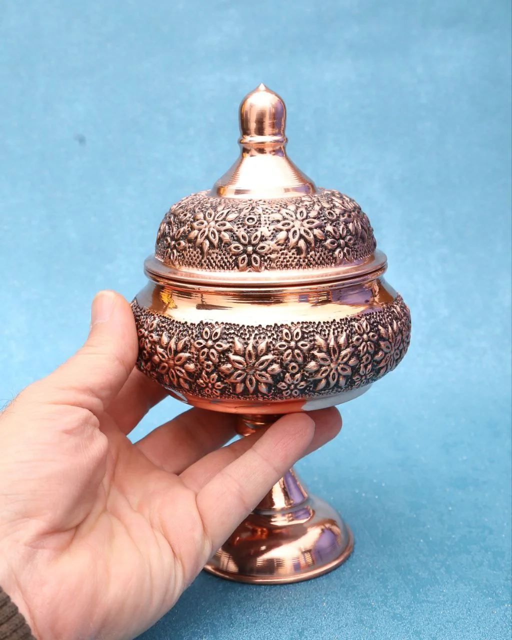 قندان مسی ریزگل تک پایه سفینه ای، ظرفی دکوری و کاربردی است که با یک پایه بلند و کشیده، به طور چشمگیری ارتفاع میز پذیرایی شما را ارتقا می دهد. این قندان که از مس خالص زنجان و با هنر دست صنعتگران محلی ساخته شده، دارای ارتفاع برجسته ۲۰ سانتی متر است که آن را بالاتر از سایر ظروف چای قرار می دهد. کاسه سفینه ای پهن آن با قطر ۹.۵ سانتی متر، فضای مناسبی برای سرو قند نقل یا شکلات فراهم می کند. وزن ۱۸۰ گرمی آن، ثبات و ایستایی لازم را برای این پایه بلند تضمین می کند. سطح این قندان با طرح ریزگل تزئین شده این بافت کوبشی بر درخشش و اصالت رنگ سرخ مس می افزاید و جلوه ای سنتی و باوقار خلق می کند. قندان تک پایه سفینه ای ریزگل، انتخابی برای کسانی است که به دنبال یک ابزار کاربردی درب دار هستند که اصالت صنایع دستی زنجان را با طراحی پایه بلند و ابهت بصری در یک ظرف سرو متمایز ترکیب کرده باشد.