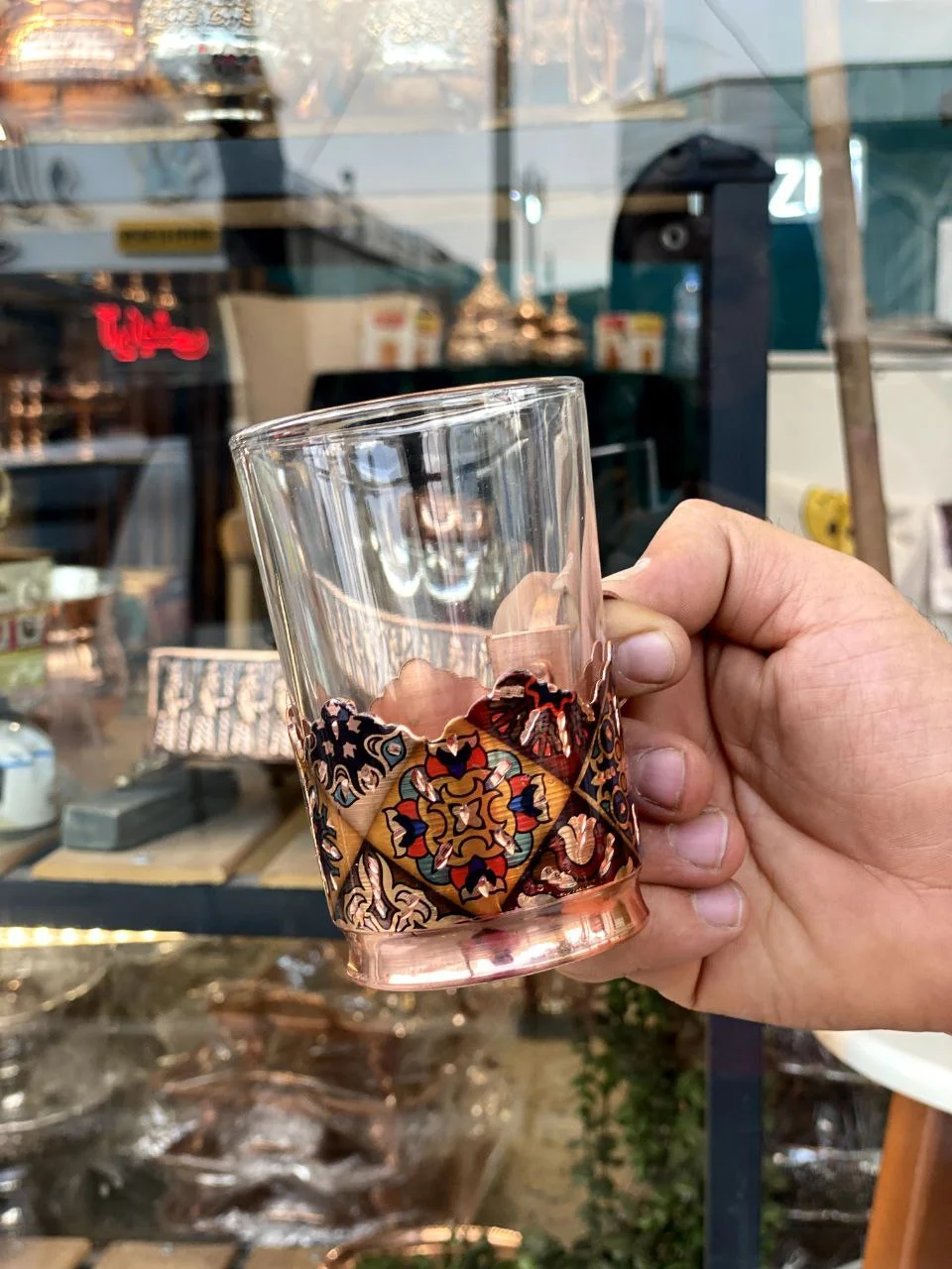 این لیوان مسی طرح ترمه تراش، تراش های مینیاتوری نه تنها تلالوِ مس را در زوایای مختلف به بازی می گیرند، بلکه بافتی ضدلغزش ایجاد کرده اند که حسِ لمسِ هنر را در هر بار نوشیدن به کاربر منتقل میکند.