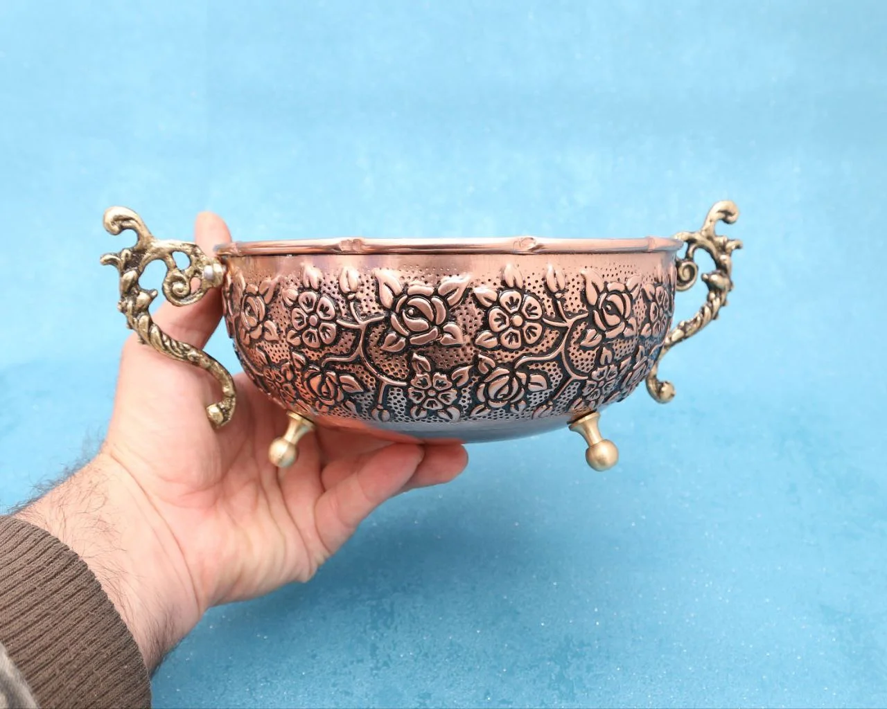 ظرف میوه خوری پایه دار مسی مدل سزار، یک اثر هنری تمام مسی با ابعاد سخاوتمندانه است که شکوه فلز مس خالص زنجان را به مرکز میز پذیرایی شما می آورد. این میوه خوری، کاملاً از مس مرغوب تولید شده و دارای یک کاسه پهن با قطر ۲۷ سانتی متر است که فضای کافی برای چیدمان بزرگ و زیبای انواع میوه ها را فراهم می کند. ارتفاع ۱۰ سانتی متری پایه، میوه ها را در سطح دید بهتری قرار داده و جلوه ای سلطنتی به آن می بخشد. وزن قابل توجه ۸۳۰ گرمی آن، ثبات و پایداری این ظرف بزرگ را تضمین کرده و حس کیفیت ساخت بالای مس خالص را منتقل می نماید. مدل “سزار” که با طراحی ساده و تمام مسی خود بر درخشش طبیعی و اصالت متریال تأکید دارد، انتخابی ممتاز برای کسانی است که به دنبال یک ظرف پذیرایی بزرگ و بادوام هستند که مهارت صنعتگران زنجان و زیبایی فلز مس را به بهترین شکل ممکن به نمایش می گذارد.